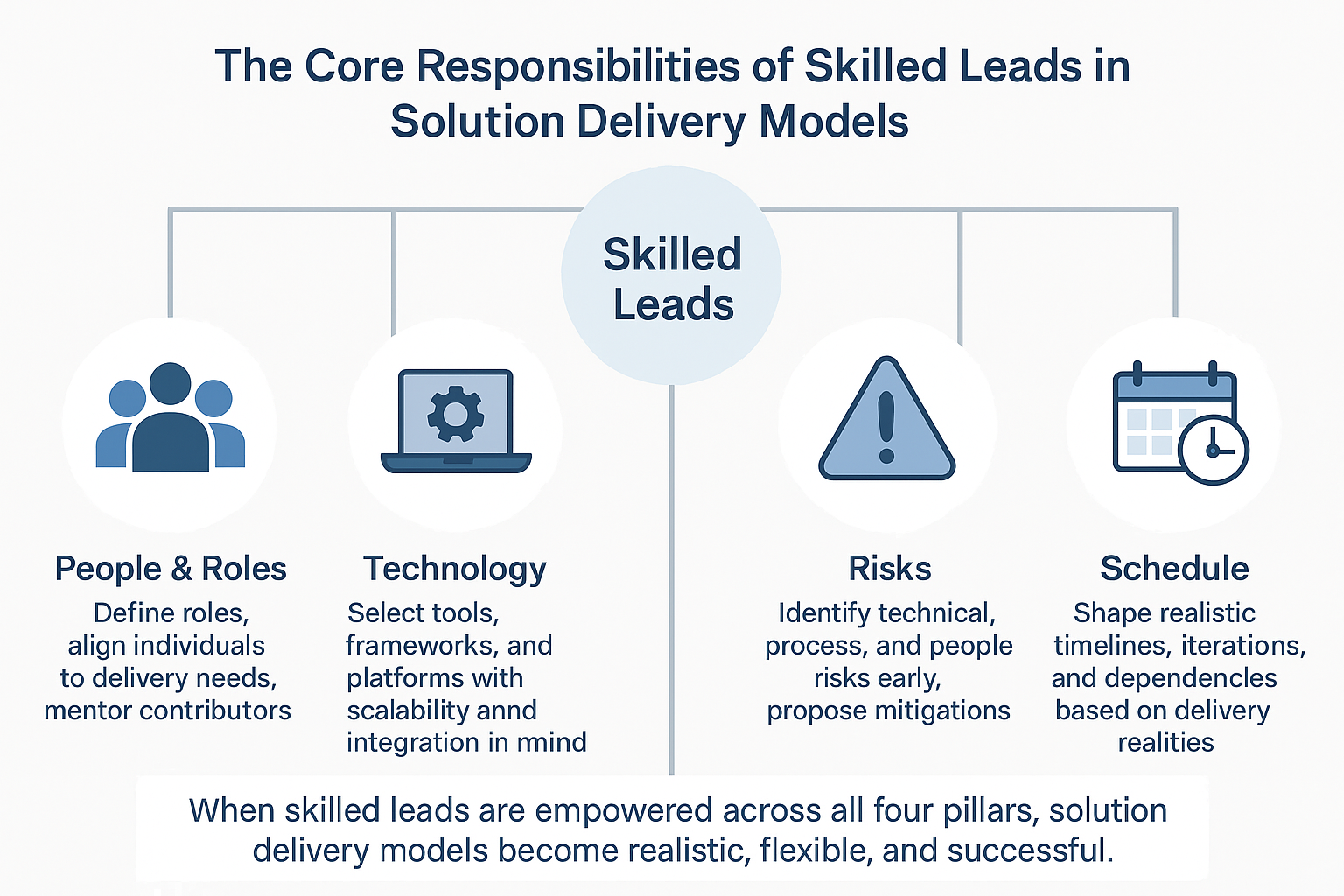 Engaging skilled leads early is only the beginning. For a solution delivery model to succeed, these leads must have clear responsibilities and the authority to carry them out. Their role is not just advisory — they are the architects of how delivery will actually work.