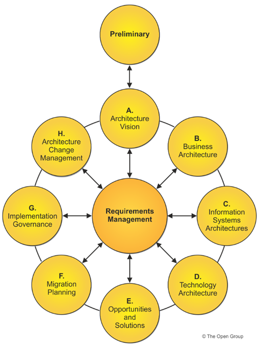 TOGAF works through a well-defined process called the Architecture Development Method (ADM), which is iterative and consists of several phases. These phases include: