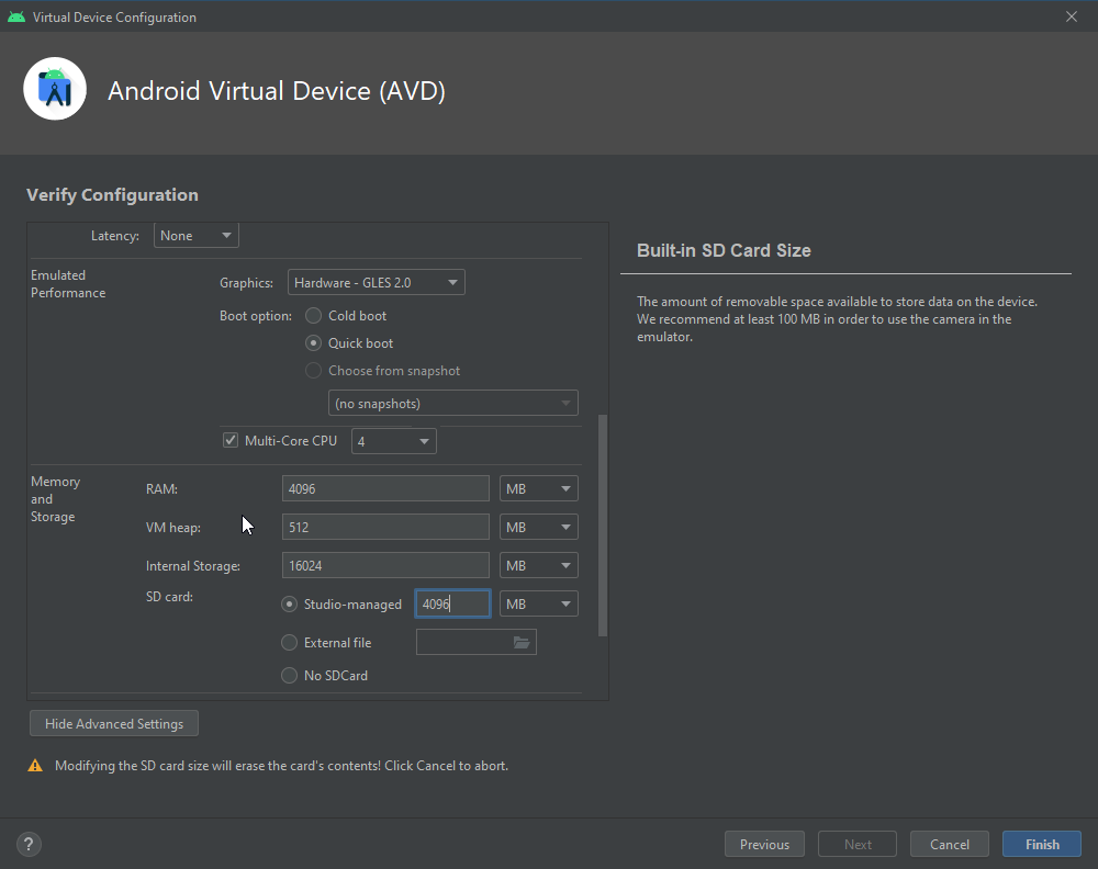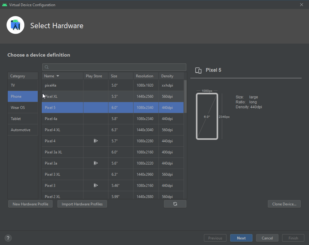Create Virtual Device. Here I am selecting Nexus 5 and setting some default parameters that have worked well for me.