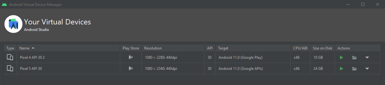 Return to Android Virtual Device manager and start the image. At this point, there will be no indication that the Play Store is installed on this device however after starting up it will display correctly. Start the emulator.