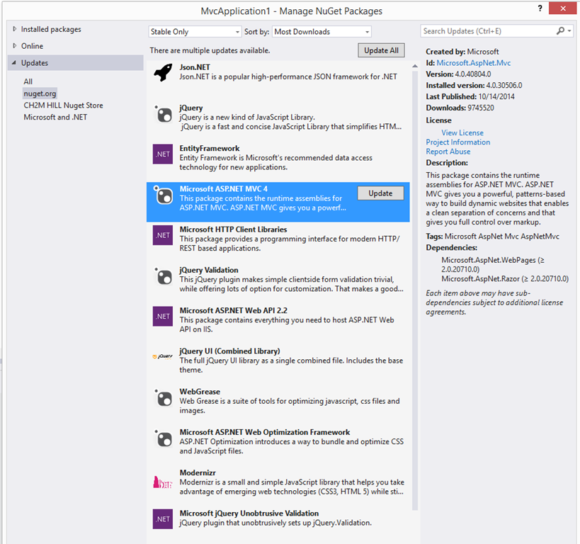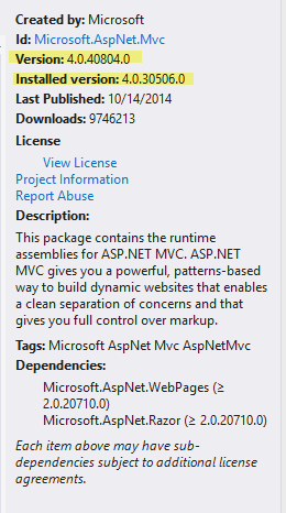 Now, we will update the Microsoft.AspNet.Mvc version 4.0.30506.0 package to 4.0.40804.0 to see what occurs.