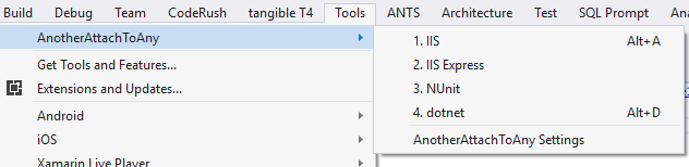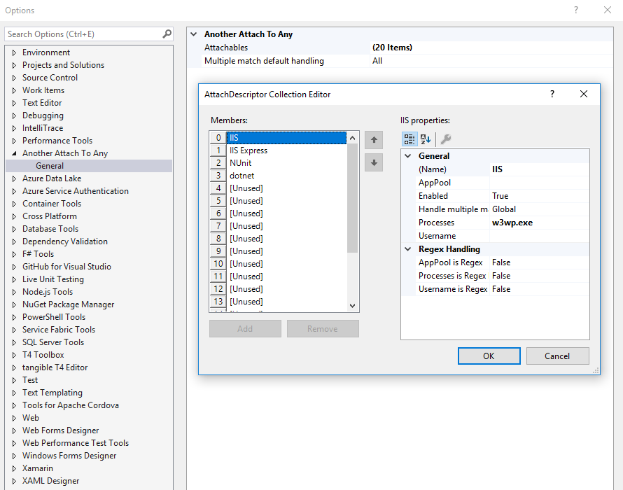 Configuration of this extension is done through Tools – Options – Another Attach To Any