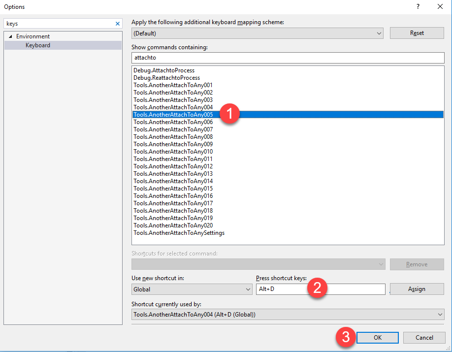 Once installed, I then set keystroke shortcut keys to execute the above steps. This is how it is currently configured to me. You can see I have Alt-A setup to immediately attach to the w3process (IIS), and Alt-D attaches to dotnet.exe.
