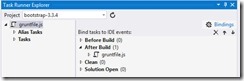 Finally, I am going to add this task to the after build step, so every time Visual Studio builds, it will execute Grunt to build the css via Less then it will copy the files to a particular directory after I build my Visual Studio project. You can do this by right clicking on the copyToServer task and select After Build binding.