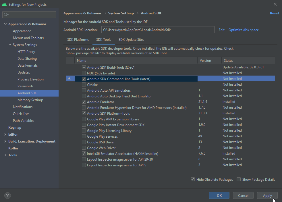 Note also here you can view your Android SDK Location: C:\Users{username}\AppData\Local\Android\Sdk