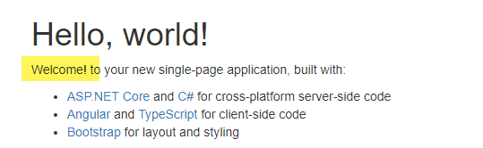 With this template, navigation/pages are not served through MVC (controllers), your ASP.NET Core solution is really setup to server data through AJAX or Rest End Points only. This is a big change from ASP.NET Web Projects where navigating to a page would open a controller which would return a View (cshtml). This is a big change! This approach is very much inline with a true SPA (where one page is loaded and navigation between pages is performed locally within the html/js via client-side routing) One more thing for this post. With your browser open to the home of the application, open ClientApp/src/home/home.component.html in VS.NET. With both the browser and VS.NET visible modify Welcome to Welcome! and save the file. Notice that the browser was aware of the html/js modification automatically, and refreshed the page. Now Welcome shows Welcome! all automatically.
