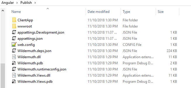 In development, the app runs in a mode optimized for developer convenience. For example, JavaScript bundles include source maps (so that when debugging, you can see your original TypeScript code). The app watches for TypeScript, HTML, and CSS file changes on disk and automatically recompiles and reloads when it sees those files change. This does not occur with a deployed web application in production. In production, the apps files are optimized for performance. When you publish the build configuration emits a minified, ahead-of-time (AOT) compiled build of your client side code. Deployment As a test I published my project to a local folder. Watching the Output window, I can see it creates a directory within my project …\obj\Release\netcoreapp2.1\PubTmp\Out then runs the following: npm install npm run build --prod ng build --extract-css “—prod” Creating directory Publish\ClientApp\dist, copies file and finished.