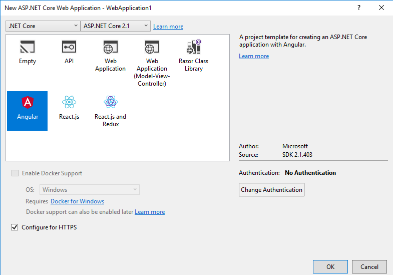 The template is equivalent to creating an ASP.NET Core projects to act as an API backend, and an Angular CLI project to act as a UI. The template offers the convenience of hosting both project types in a single app project.