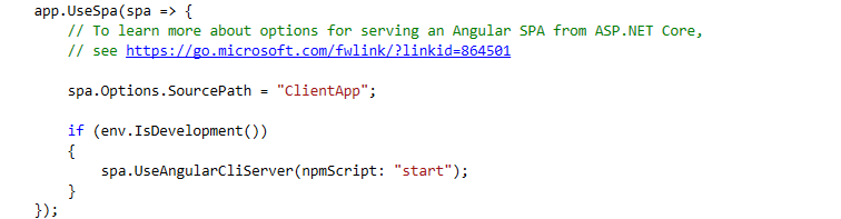 So, the pattern at this moment is 1. Modify Startup.cs (comment out the UseAngluarCliServer and add the UseProxyToSpaDevelopmentServer methods below) //spa.UseAngularCliServer(npmScript: "start");
