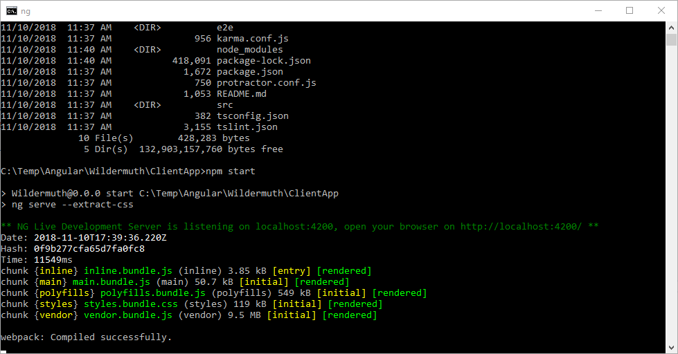 The downside of letting VS.NET/ASP.NET Core run both sides, is that anytime c# is modified you will have to startup both the web and backend. This can be time consuming, as it does take some time to restart the web server. “The project is configured to start its own instance of the Angular CLI server in the background when the ASP.NET Core app starts in development mode” To run Angular CLI server externally, independently of the ASP.NET Core process you can open a command prompt, navigate to the Clientapp directory and type npm start which as mentioned above can be found as a script within the package.json. Runs the following: “start” : “ng-serve --extract-css"