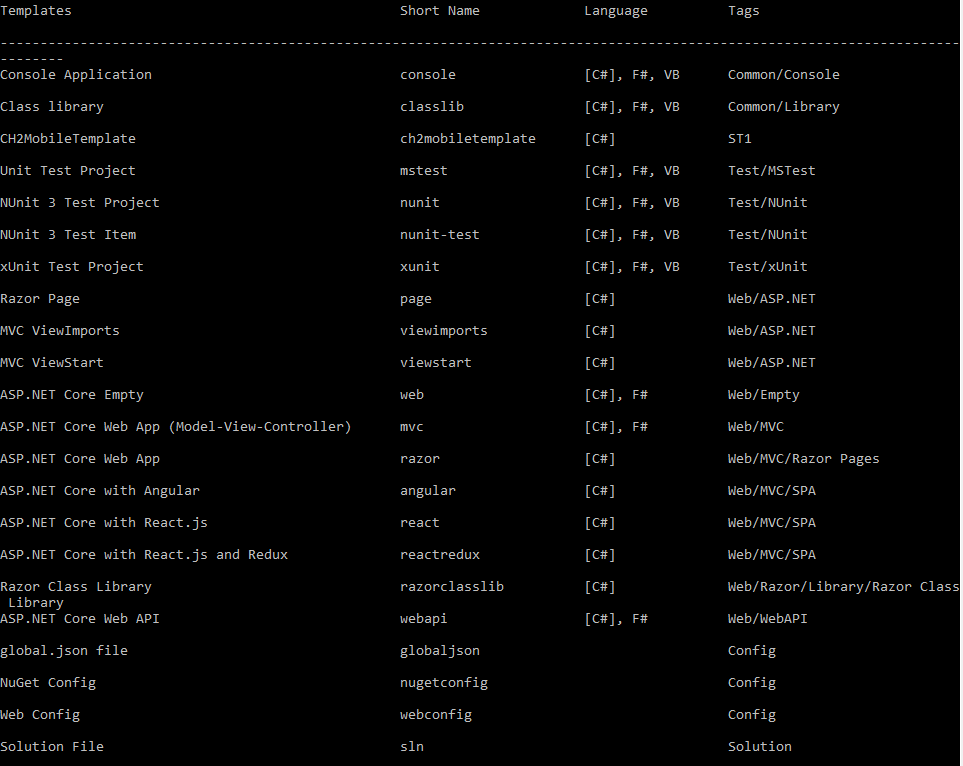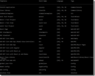 So starting this off, looking for a Vue.js SPA template within Visual Studio…nope not available. Using command line dotnet new –l you can see it is not within the template package from Microsoft.