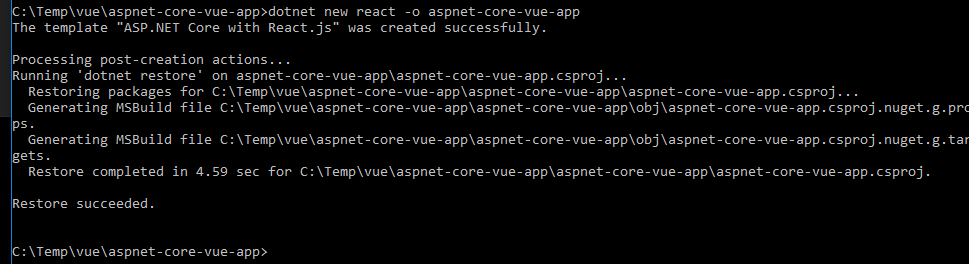 Vue CLI sets up a project with features: hot module replacement, tree-shaking, code-splitting, webpack 4 etc. node –v will display the version of node installed, likewise vue --version gives us the vue.js installed. With vue 3 cli we can use the CLI to create a project or a GUI to set it up. Using the CLI first, we will create a asp.net core solution based on the existing react template. dotnet new react –o aspnet-core-vue-app (this is the same as File-New Project within VS.NET and choosing the react template)