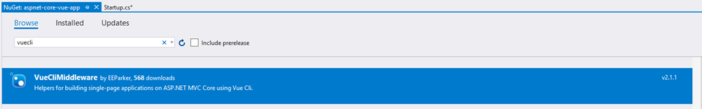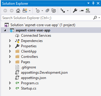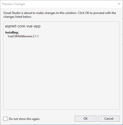 Make the following changes within Startup.cs configuration.RootPath = 'ClientApp/build'; => configuration.RootPath = 'ClientApp/dist'; app.UseHttpsRedirection(); => // app.UseHttpsRedirection(); comment out (we do not want to deal with https certificates at this moment) Add nuget package VueClieMiddleware ![]()