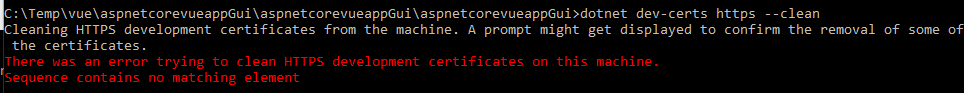 vue-cli-service serve '--port' '8080' INFO Starting development server... The error message told me to run dotnet dev-certs https --clean