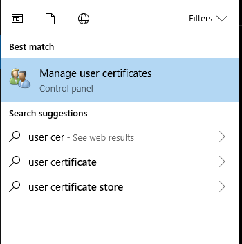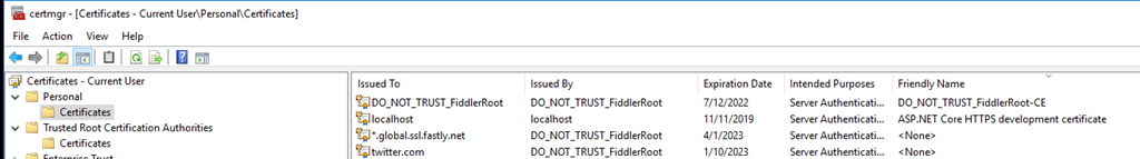 I did this under Certificates Current User – Personal > Certificates (sort by friendly name, select all and remove) Trusted Root