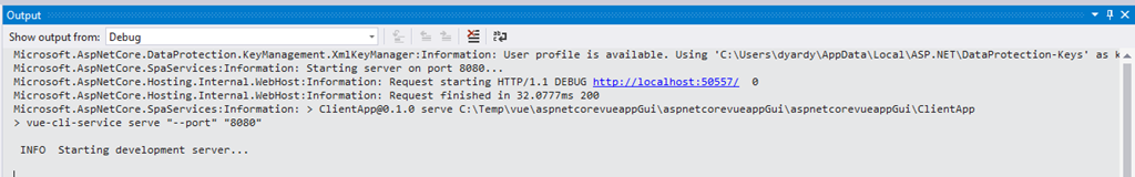 A vue app is created on the file system, which will be copied again to our Visual Studio project (on top of the ClientApp directory) that was the original React application. Build the project…. ========== Rebuild All: 1 succeeded, 0 failed, 0 skipped ========== 1. Pressing F5 to run the application, you can see within the Output – Debug window the operations… Microsoft.AspNetCore.DataProtection.KeyManagement.XmlKeyManager:Information: User profile is available. Using 'C:\Users\dyardy\AppData\Local\ASP.NET\DataProtection-Keys' as key repository and Windows DPAPI to encrypt keys at rest.
