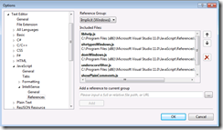 With the latest Visual Studio a new file _references.js is found in the scripts directory. As you probably know, the // <reference path=”…” /> syntax was introduced in Visual Studio long time ago to make you able to have intellisense in any JavaScript file to include everything defined in the JavaScript located at this path. Said another way if you write the very first line in any JavaScript file, say “my-page.js”, and make sure the path points to the proper jQuery file, when you write code in “my-page.js”, you’ll get intellisense for everything in the jQuery file.
