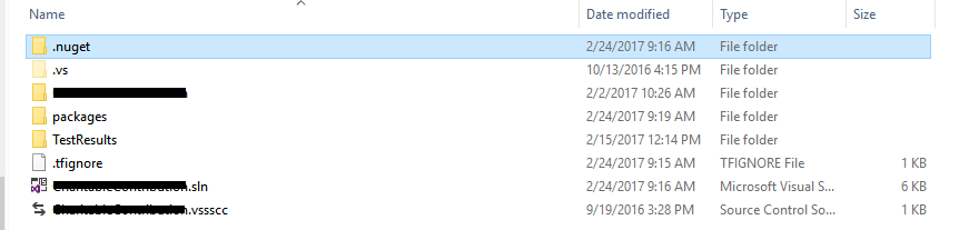 So at this point, you have a directory .nuget with the nuget.config file within it, and also a text file .tfignore at the solution level. Remove any packages that have been put in source control previously and check in.