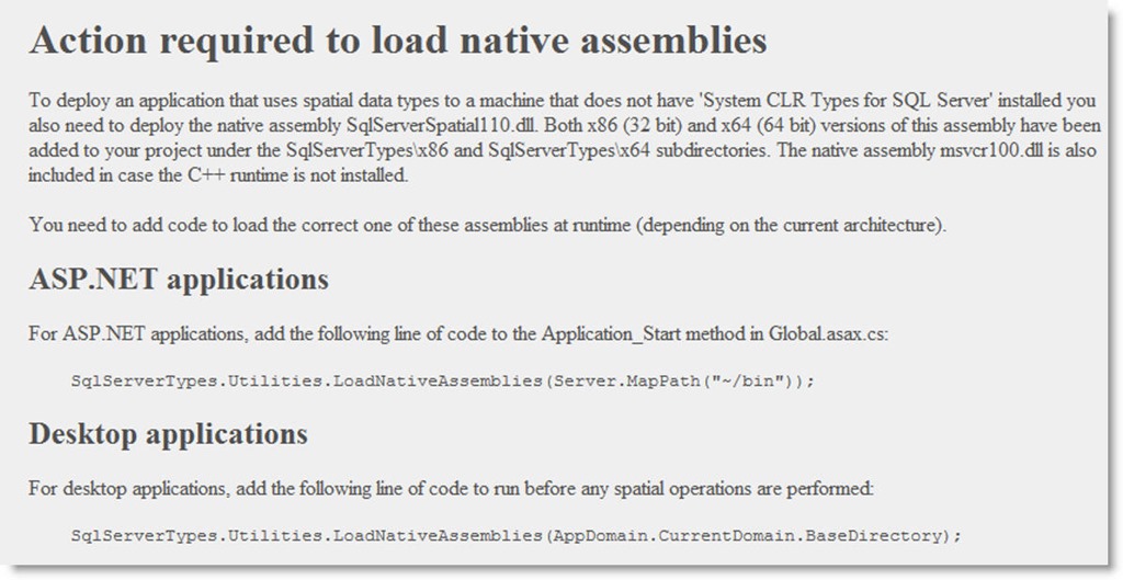 Recently, started working with SQL Server GeoSpatial types. Specifically I am using column type geography. All was working fine when using on localhost web site however after deployment to a test environment, I go the following exception.