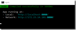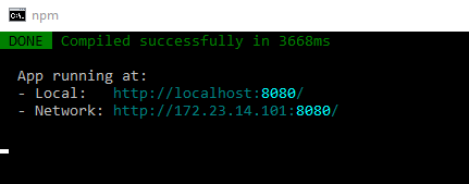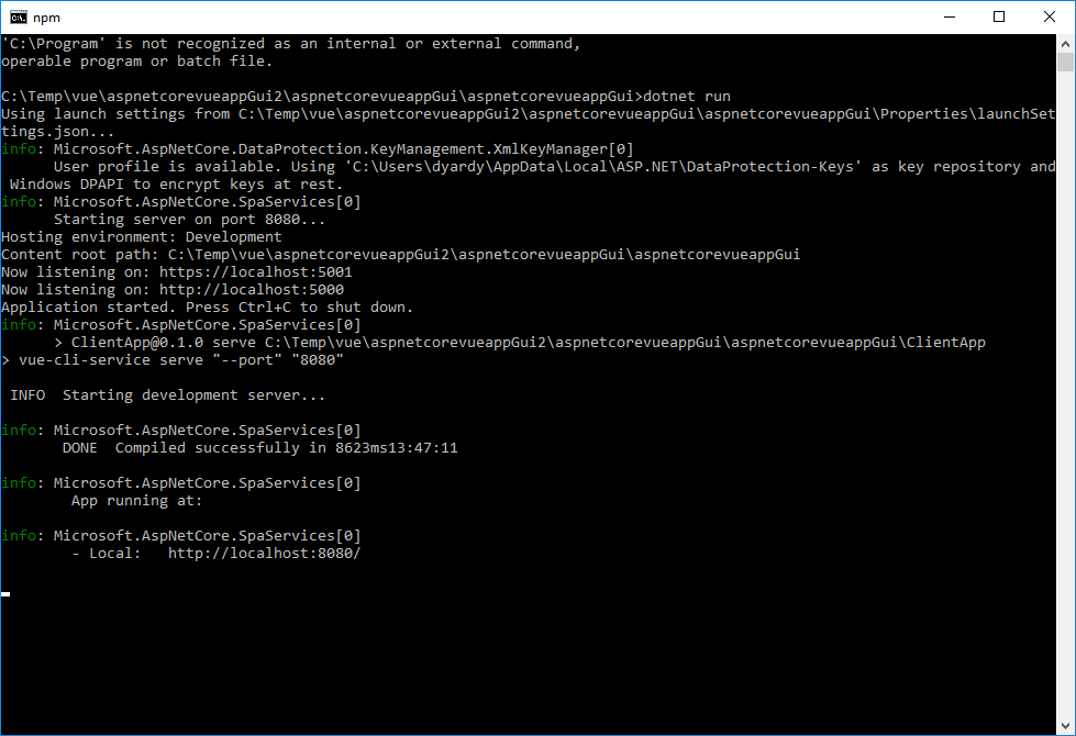 *npm run serve from a command prompt/terminal window and opening browser to http://localhost:8080 The c# debugger is not attached, however I will show how to attach to the dotnet.exe process below. The port used is defined within Startup.cs spa.UseVueCli(npmScript: "serve ", port: 8080);