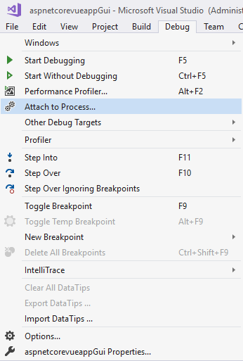 The c# debugger is not attached, however I will show how to attach to the dotnet.exe process below. The port used is defined within Startup.cs spa.UseVueCli(npmScript: "serve ", port: 8080);