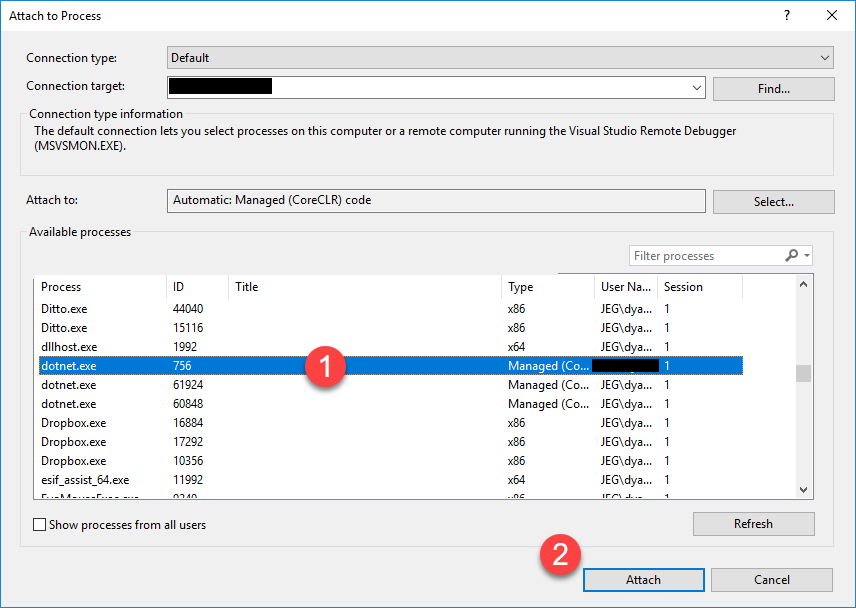 Attaching from within Visual Studio to the dotnet.exe process Debug – Attach to Process