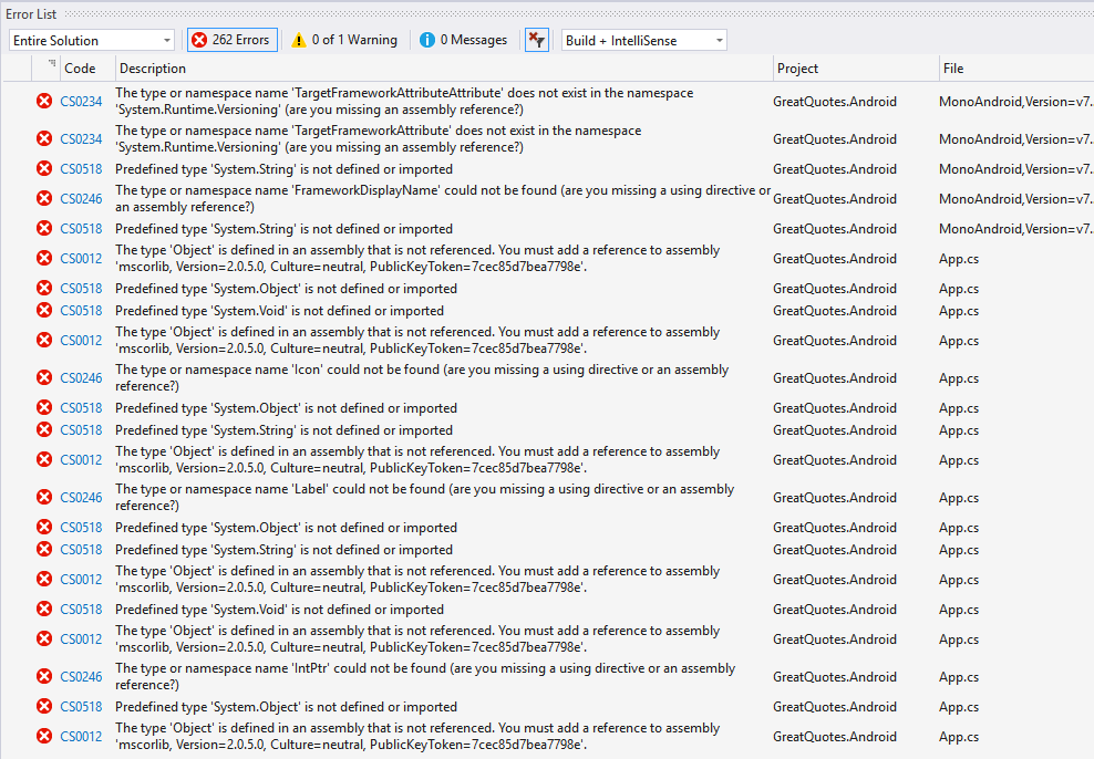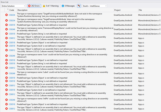 GreatQuotes.Android C:\Users\dyardy\AppData\Local\Temp\MonoAndroid,Version=v7.1.AssemblyAttributes.cs 4 ActiveError CS0518 Predefined type 'System.String' is not defined or imported GreatQuotes.Android C:\Users\dyardy\AppData\Local\Temp\MonoAndroid,Version=v7.1.AssemblyAttributes.cs 4 ActiveError CS0246 The type or namespace name 'FrameworkDisplayName' could not be found (are you missing a using directive or an assembly reference?) GreatQuotes.Android