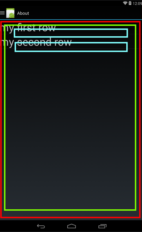 Continuing from my drawer example code…I have a fragment (About) where I want to show a number of rows. There are a few ways of doing this but in my case I am going to use a ListView.